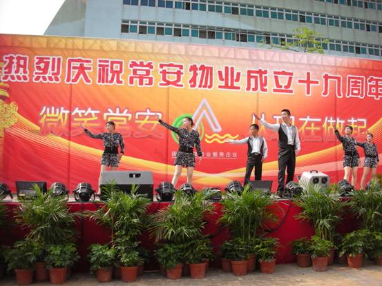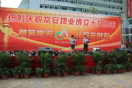常安物業(yè)十九周年慶典于2014年4月19日下午在百旺信園區(qū)廣場成功舉辦,來自各服務中心的一百多位同事齊聚現(xiàn)場,共同慶祝常安十九周歲生日!現(xiàn)場活動十分精彩,有充滿活力的舞蹈、情感真摯的詩歌朗誦,還有優(yōu)美動聽的情歌對唱,此外還加入了以“微笑常安”為主題的征文朗誦和頒獎典禮?;仡櫝0彩拍陙淼膴^斗史,我們常安人榮辱與共,迎來輝煌的今天;今天我們攜手共進,展望未來,明日再攀成功的高峰。讓我們共同舉杯,祝愿我們常安的明天會更好。