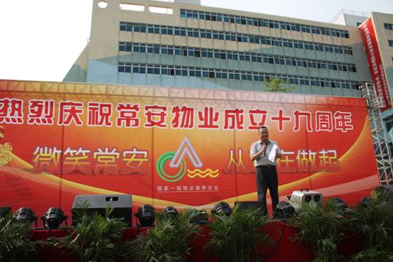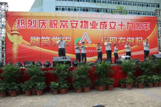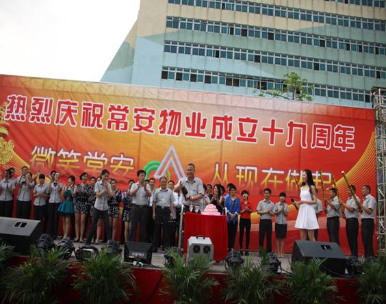 常安物業(yè)十九周年慶典于2014年4月19日下午在百旺信園區(qū)廣場成功舉辦,來自各服務中心的一百多位同事齊聚現(xiàn)場,共同慶祝常安十九周歲生日!現(xiàn)場活動十分精彩,有充滿活力的舞蹈、情感真摯的詩歌朗誦,還有優(yōu)美動聽的情歌對唱,此外還加入了以“微笑常安”為主題的征文朗誦和頒獎典禮?;仡櫝0彩拍陙淼膴^斗史,我們常安人榮辱與共,迎來輝煌的今天;今天我們攜手共進,展望未來,明日再攀成功的高峰。讓我們共同舉杯,祝愿我們常安的明天會更好。